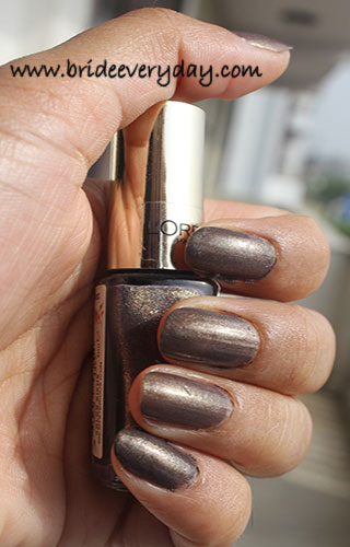 L’Oreal Paris Mysterious Icon (shade no: 805) – This shade is quite close to coyote shade of brown. I would say a little darker than that. It is also instilled with micro-shimmer particles, which softens the look of this otherwise bold shade. Goes well with all skin tones, takes a couple of minutes to dry and has a good chip off time. I do not wear it on my toe nails as it makes my feet look darker than their normal color ;-)
