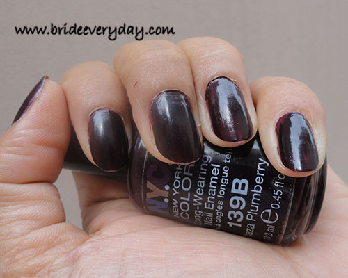 NYC Plaza Plumberry (Shade no: 139B) – This shade is a mix of seal brown and burgundy; a loud shade that does not make it to my daily wear product list. But I love this shade as much as I love eating paneer (I eat it occasionally- you could guess why ;-) ). Being a dark shade it gives a streaky effect after one coat. Usually, I have to top up 2-3 coats to get the original plumberry shade. It dries instantly but chips off early, probably because of the multiple layers that do not get to stick firmly.