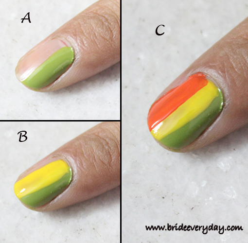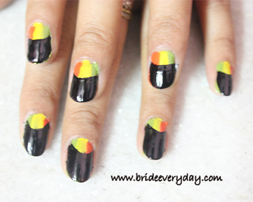 Step 2: Choose the base color, for the crescent or inverted moon shape. Ensure that this is a totally opaque color or the one that does not require too many coats to cover the translucency. Before moving on the next step, wait for the base color to dry. Otherwise you will end up mixing the 2 colors. For this tutorial I am using a combo of three neon colors as the base color.