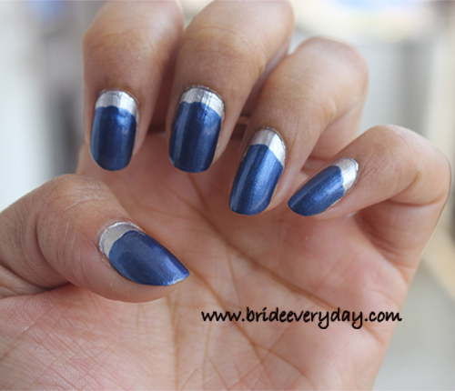 Ruffian Manicure is usually done with dark contrast colors. Shades like Corals, nudes will not work great for Ruffian Manicure for two reasons. Firstly, those shades have to be applied a number of times to remove streakiness, and that will give the nail a slump look. Secondly, the top color has to be dark and opaque enough to prevent the base color from peeking underneath. The best shades for Ruffian Manicure are dark, bright, and most importantly opaque. If a shade is dark and opaque you can get the perfect clean look in 1 or maybe 2 coats. However, you can choose any dark (opaque) color but the best look would be attained with a contrasting combo. The most worn combo is a contrast of black and gold, where gold is the crescent and black is the top coat.