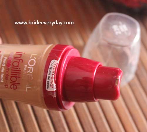 Loreal paris infaillible foundation comes in a see through bottle with a wine colored pump dispenser, which has a transparent plastic cap. The packaging is quite heavy and sturdy that I guess would save the bottle from breakage even after an accidental fall. Though I have not tried testing this height of sturdiness but it has proved safe for travelling. No spillage at all, even the cap remains intact amidst a bag full of goodies.